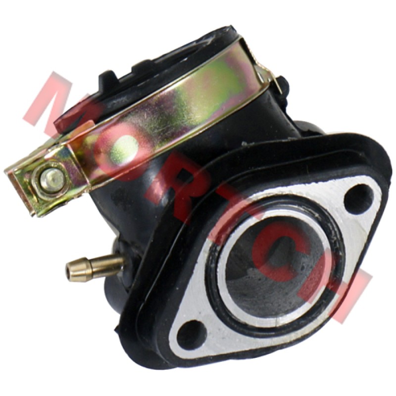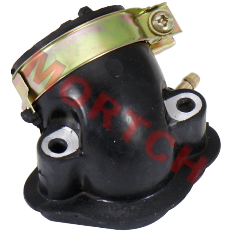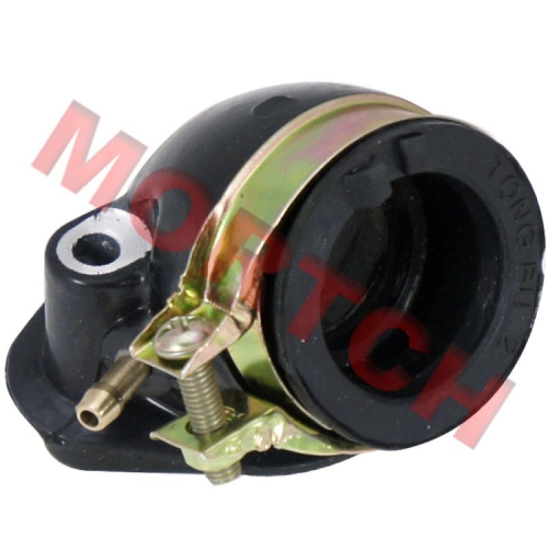Intake manifold with a single vacuum fitting. Fits 125/150cc GY6 engines. Connects the carburetor to the cylinder head.